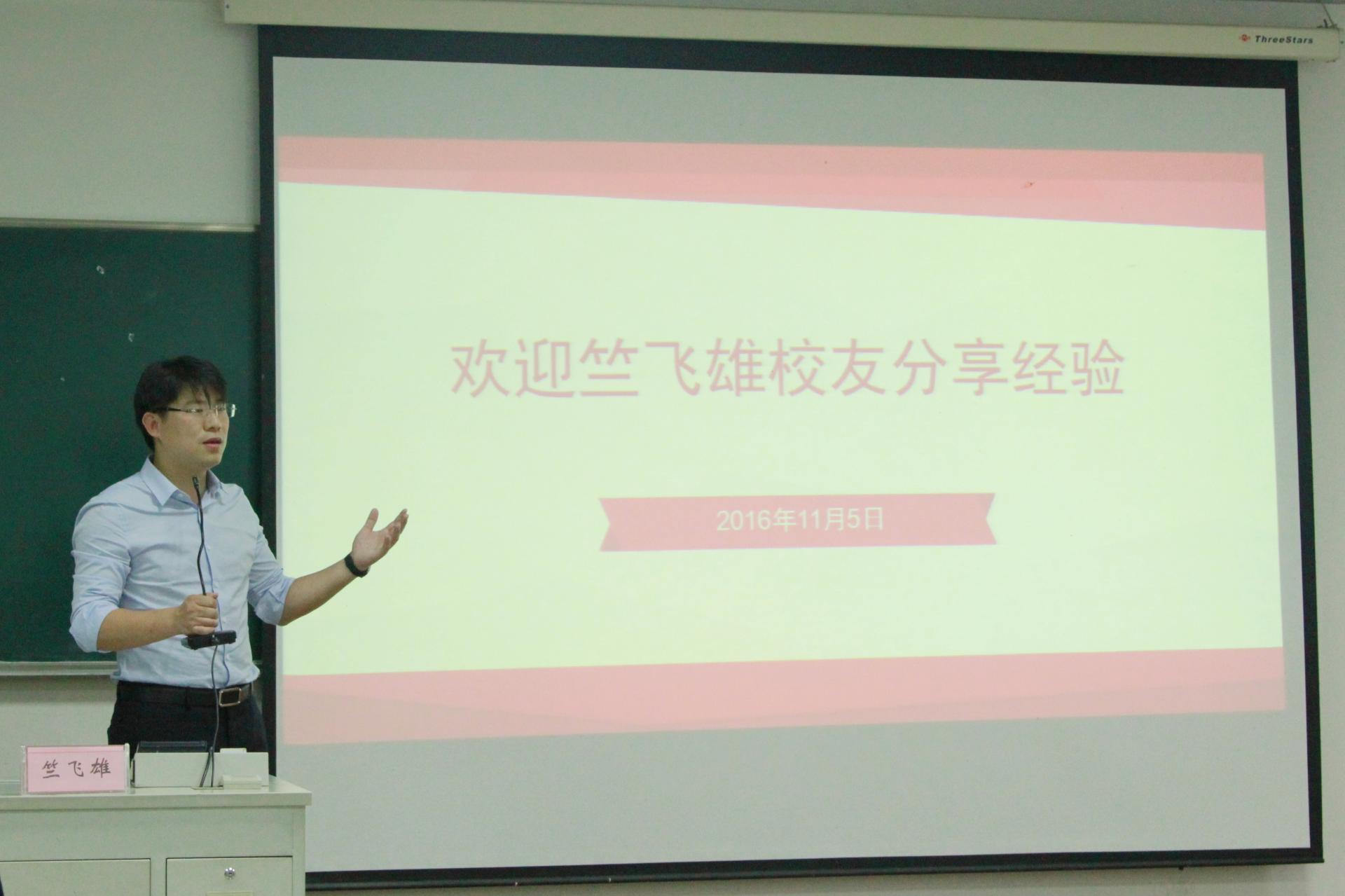 01级法学专业毕业生,现为浙江金穗(杭州湾新区)律师事务所主任。竺飞雄校友向大一新生分享充实度过四年大学生活的经验,他告诉同学们,在校园里70%的时间和精力应该用来学习,而社会交流也不能忽视,大一新生应积极参加社团和学生组织活动以扩大自己的交往面,在社会实践中提升自己,同时他也向同学们强调要不断尝试去发现自己的兴趣。随后,曾创立了多个公司、公司产品在电商行业取得全国销售冠军的竺飞雄校友谈及自己的创业经历,并表示在创业期间与员工的交流和沟通是极为重要的。