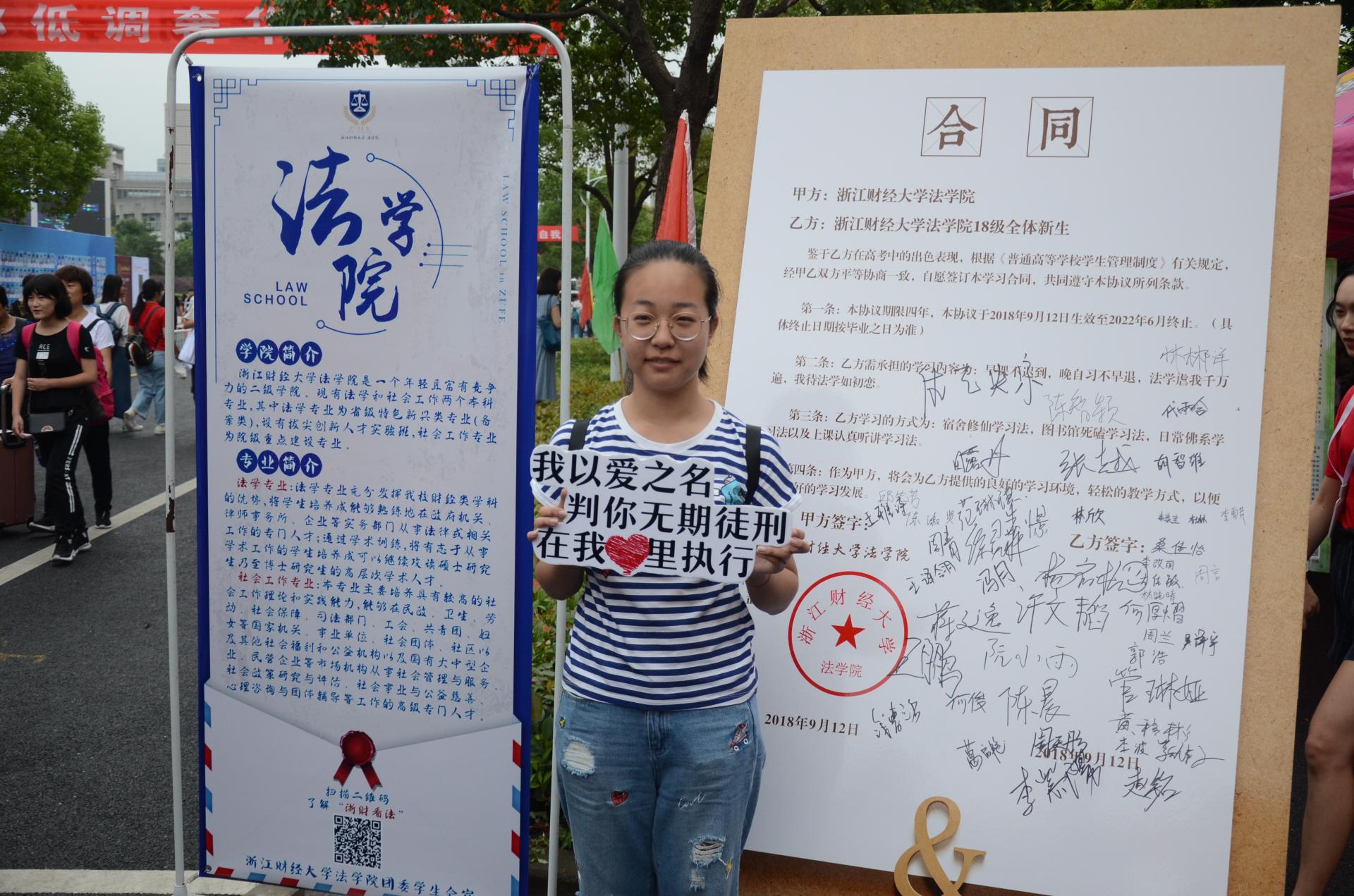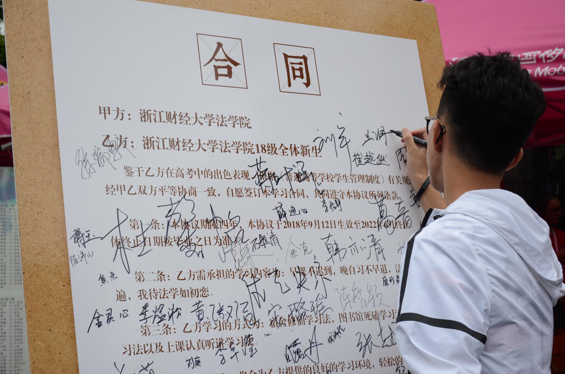 报到现场,新生们在学生会提前准备的“新生合同书”展板上郑重签下自己的姓名,向色播