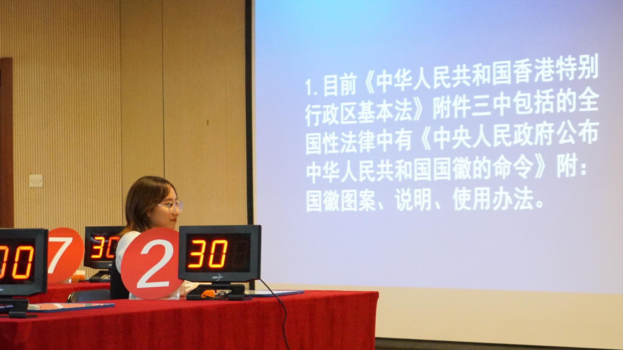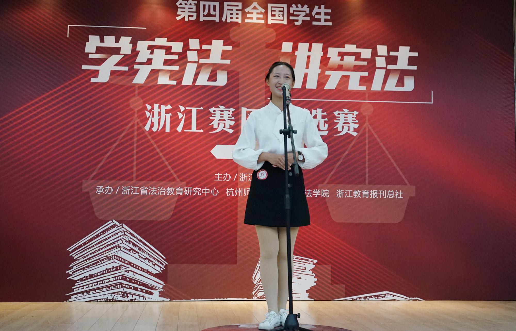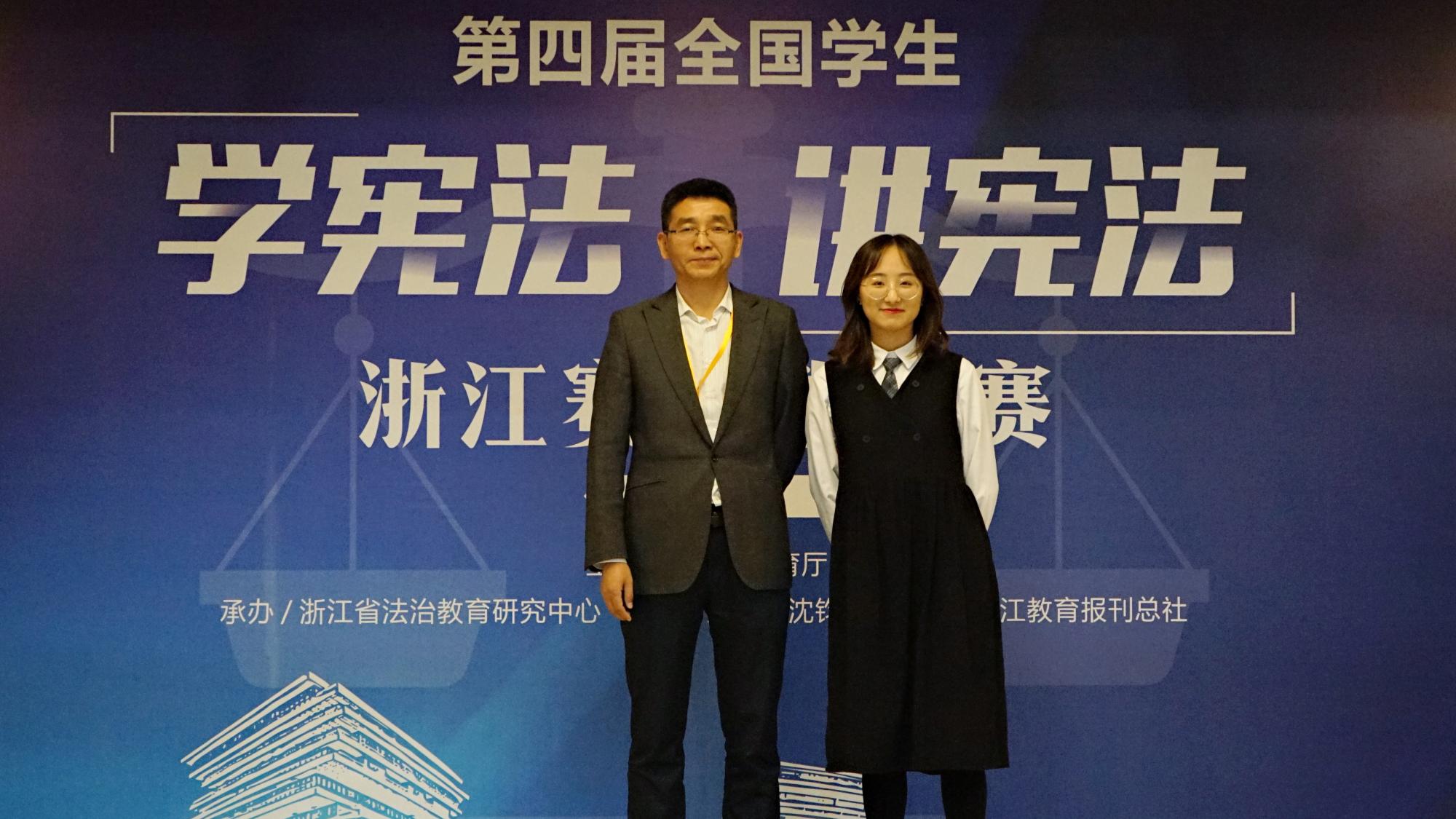 参加省赛。比赛中,刘玲妍同学积极应对,一度连续三次抢得答题机会并回答正确得分,精彩表现获得现场阵阵掌声,最终获得知识竞赛一等奖。林汶璇同学紧紧围绕宪法的主题,生动地讲述了《中华人民共和国宪法》的历史渊源和近代发展,探索了《中华人民共和国宪法》联接浙江发展的有效途径。饱满的感情、流利的表达、较强的现场感染力,让林汶璇同学在所有选手中脱颖而出,以第四名的优异成绩斩获一等奖。