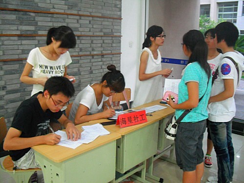 楼,招兵买马的火爆场面便呈现在我们的眼前。每个社团的负责人努力的介绍着自己社团的特色,用各种方式彰显社团的亮点。因此,招新刚开始不久,各社团的招新现场便是人山人海,新生们踊跃报名,积极参加,他们都在寻寻觅觅,寻找着那个自己感兴趣的社团。为了此次招新活动圆满召开,社管中心的全体干事纷纷出动,搭设“社管中心咨询台”,为新生们介绍各个社团的职务。他们温暖的笑容,详细的解答,赢得了在场新生们的好评。