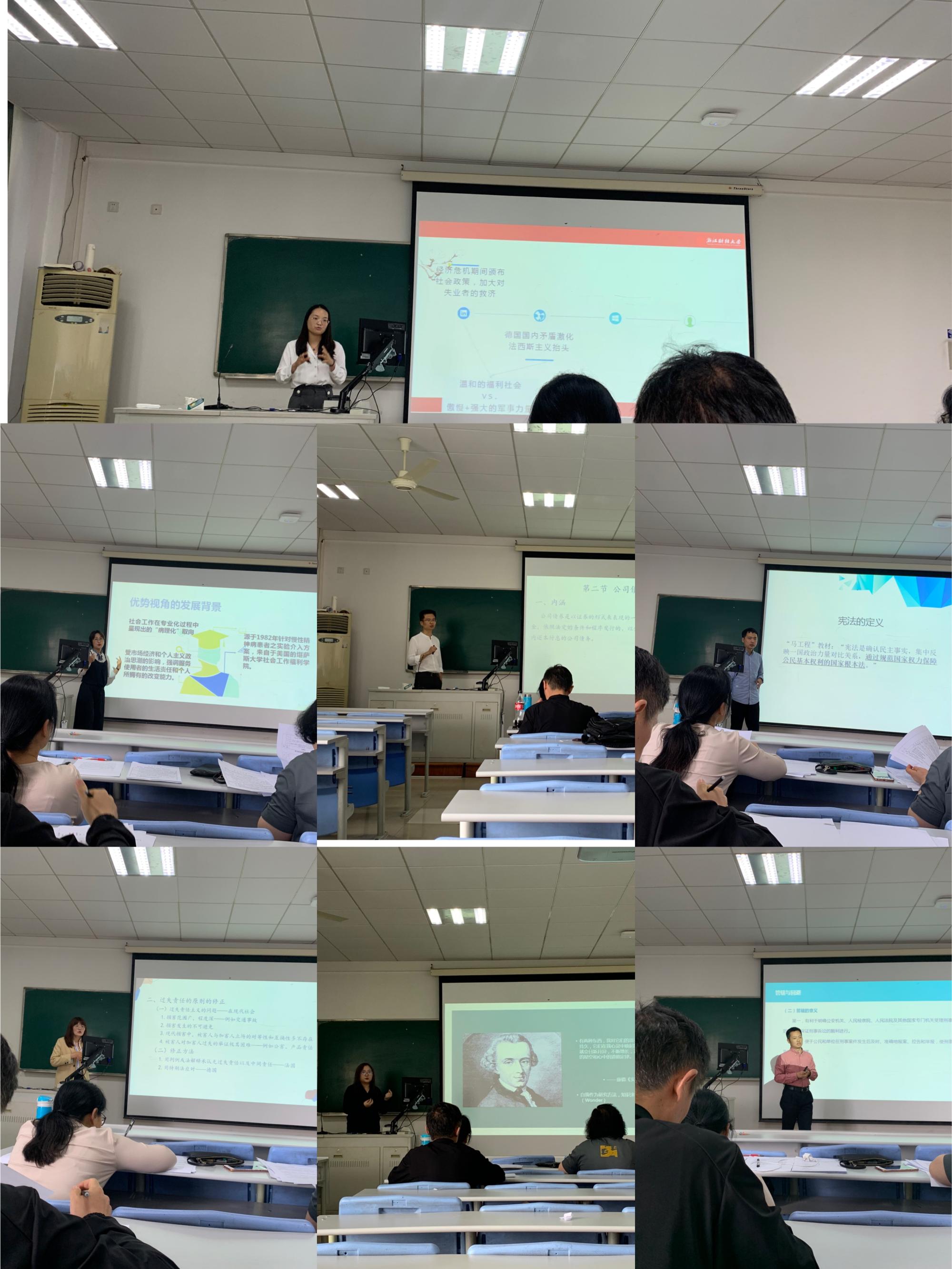 2021年青年教师教学技能比赛在303教室举行。比赛邀请了康莉莹、王春霞、孟涛、郝艳兵、韩宗生五位老师担任评委。来自宪法与行政法系的李亢、民商法系的刘媛媛、陈波、刑法与诉讼法系的王金建、社工系施旦旦、胡梦茵、安真真七位教师参加了本次比赛。