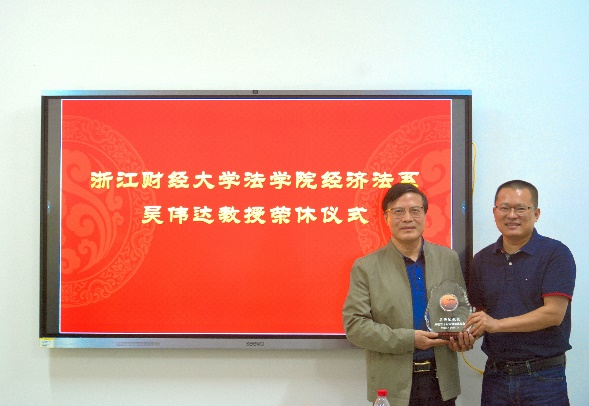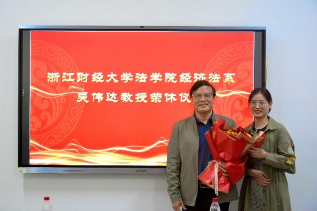 曹璋和刘静两位教师代表经济法系分别向吴伟达教授赠送了纪念品和鲜花。