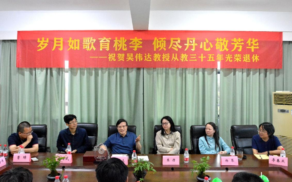 ,一个专业,三十五年的坚持和付出,足令后辈高山仰止;文绪武老师赞赏吴伟达老师既是才子,又是帅哥,融合了年轻、和蔼、儒雅于一身,淡泊名利、高风亮节;陈波老师感叹吴伟达老师作为一名老教授在指导学生、科研方面仍能保持一贯的认真和努力,是年轻一辈的学习榜样;刘静老师认为吴伟达老师在言谈举止中透露着淡雅气质,关爱学生,极具人格魅力;最后李春燕老师感谢吴伟达老师在教学和科研方面对自己的无私指导,祝福他退休生活开心、诸事顺遂。