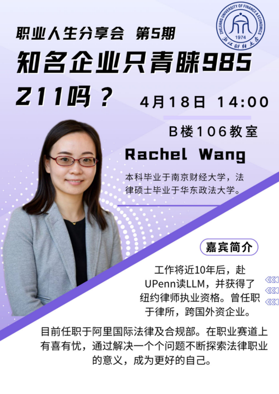 2024年4月18日,2023级非诉实验班班主任张晓晨老师邀请到了宾夕法尼亚大学法学硕士、纽约州执业律师、阿里巴巴国际及法律合规部Rachel Wang女士,为色播