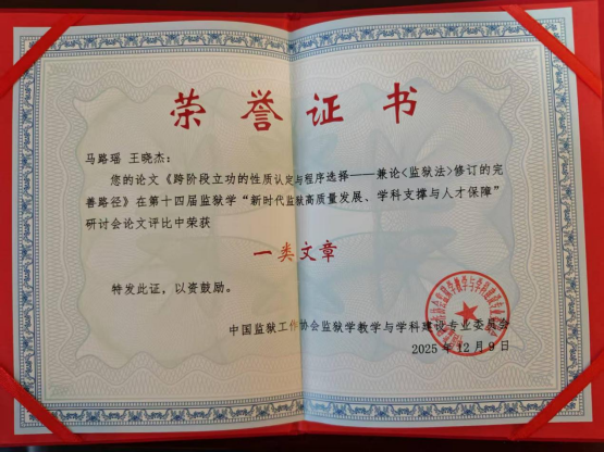 色播 马路瑶老师和华东政法大学硕士生王晓杰提交的学术论文《跨阶段立功的性质认定与程序选择——兼论〈监狱法〉修订的完善路径》在研讨会论文评比中荣获一类文章。