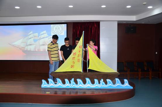 紧接着,在座老师与毕业班学生代表宋国彪、14级学生代表刘化良将帆船的大帆挂起。淡黄色的旗帜,天湖蓝的旗杆,看似饱经历史蹉跎却仍承载着希望与梦想的帆船,迎着丝丝浪花,展现在了舞台上。
