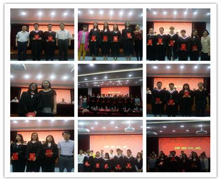接着是荣誉表彰环节,院长助理、社工系主任童志锋宣读了司考优秀班级、优秀寝室、考研优秀班级、优秀个人名单;副院长李政辉宣读2015届毕业生获得毕业证书、学位证书名单;副院长蒋铁初宣读省、校、院三级优秀毕业生名单;党总支副书记罗金艳宣读2015届校友联络员名单。随后,主席台领导及出席的教师分别向获奖的同学们颁发了荣誉证书和聘书。