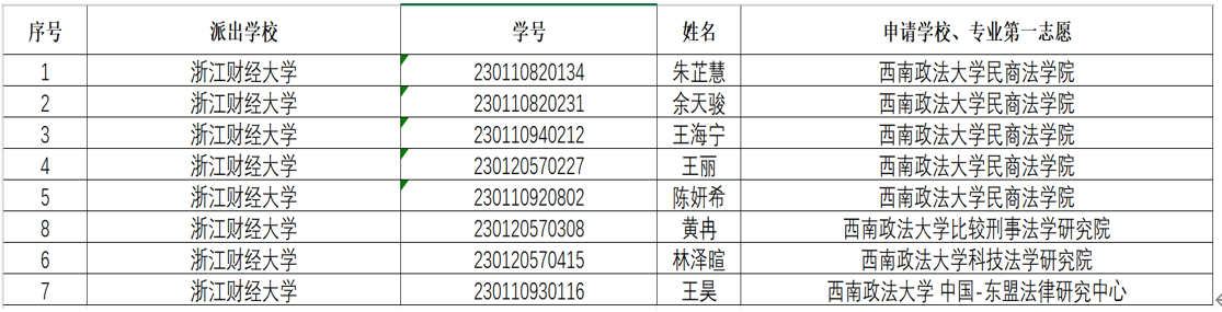 现推荐8名学生2024-2025学年第1学期赴西南政法大学交流学习。推荐名单公示如下,本结果公示3天。