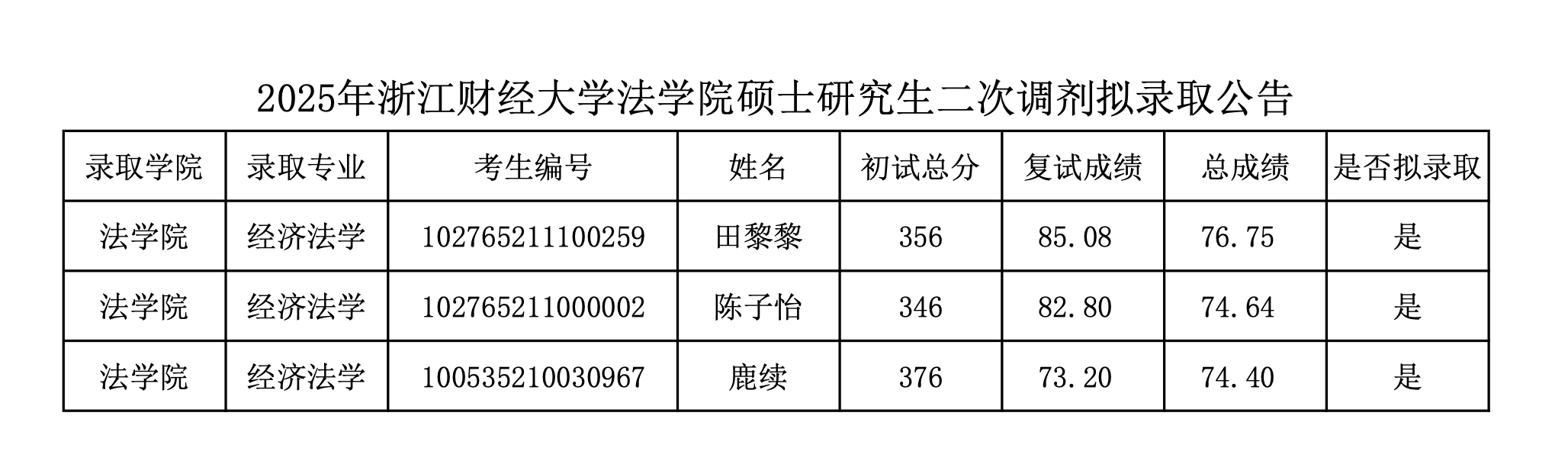 因色播 招生计划调整,经济法学硕士研究生新增3个招生名额,经色播 硕士研究生复试专家小组复试,现将二次调剂拟录取名单公示如下,现予以公示(公示期7天)。如有异议,请联系色播 研究生办公室,联系电话:0571-87557364,联系人:封老师。