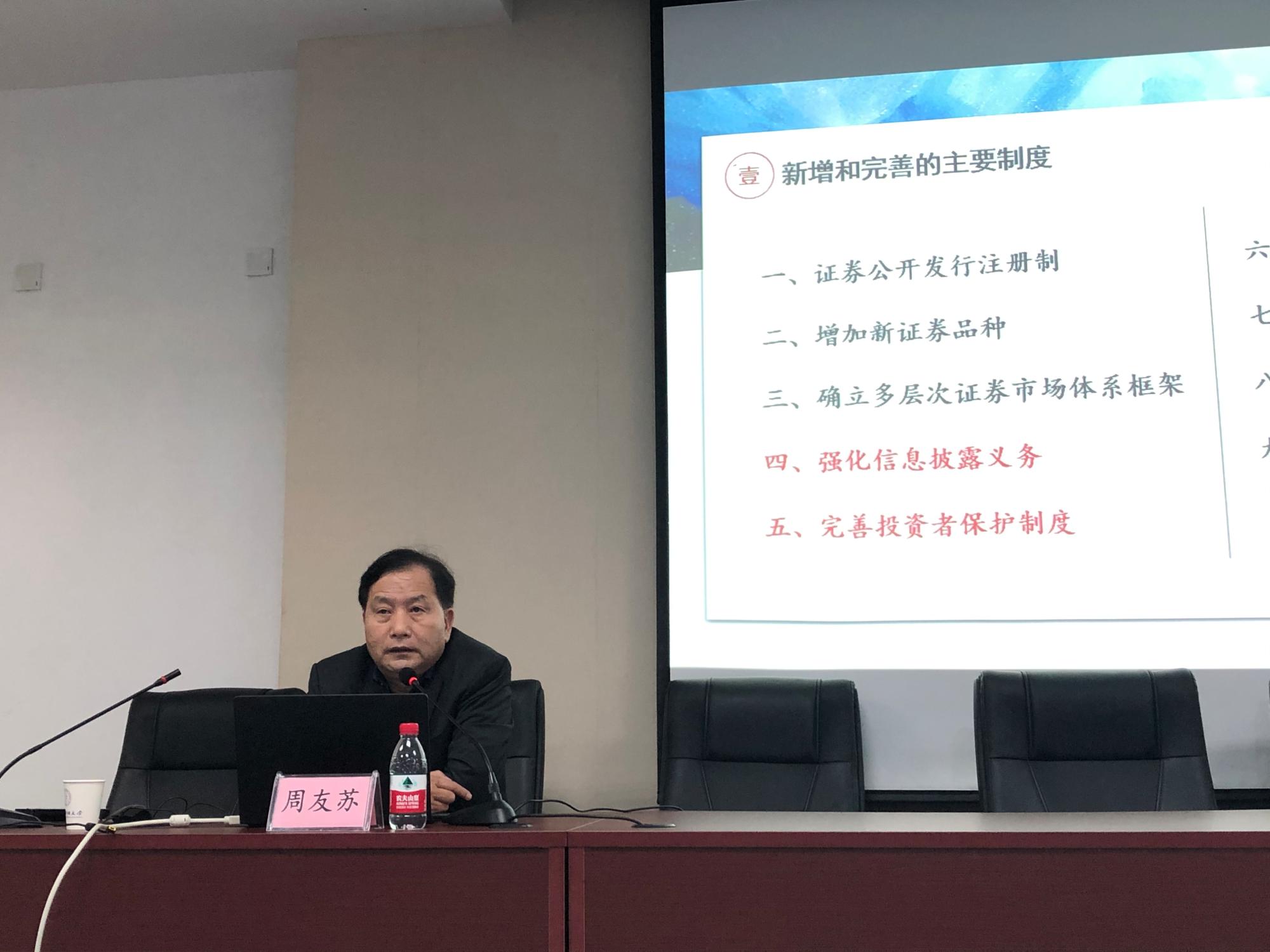 周友苏教授以2020年3月1日起正式施行的《证券法》作为切入点,从证券法新增和完善的主要制度、信息披露制度创新及法律适用、投资者保护制度创新及法律适用三个大方面详尽展开,系统地总结了我国证券市场改革发展、监管执法、风险防控的实践经验。周教授将法律的文本和工作中的所见所闻的真实、鲜活的案例结合起来,展开了新颖深刻的探讨,理论联系实践层层递进,使师生们耳目一新。