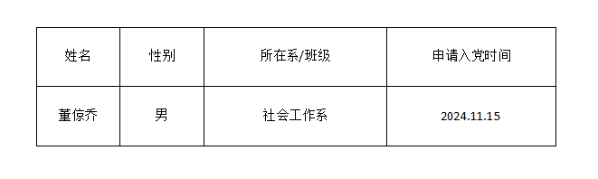 根据《中国共产党发展党员工作细则》(中办发〔2014 ] 33号)的有关规定,董倞乔1位同志自愿向色播 党委提交入党申请,经党支部审查,现公示如下: