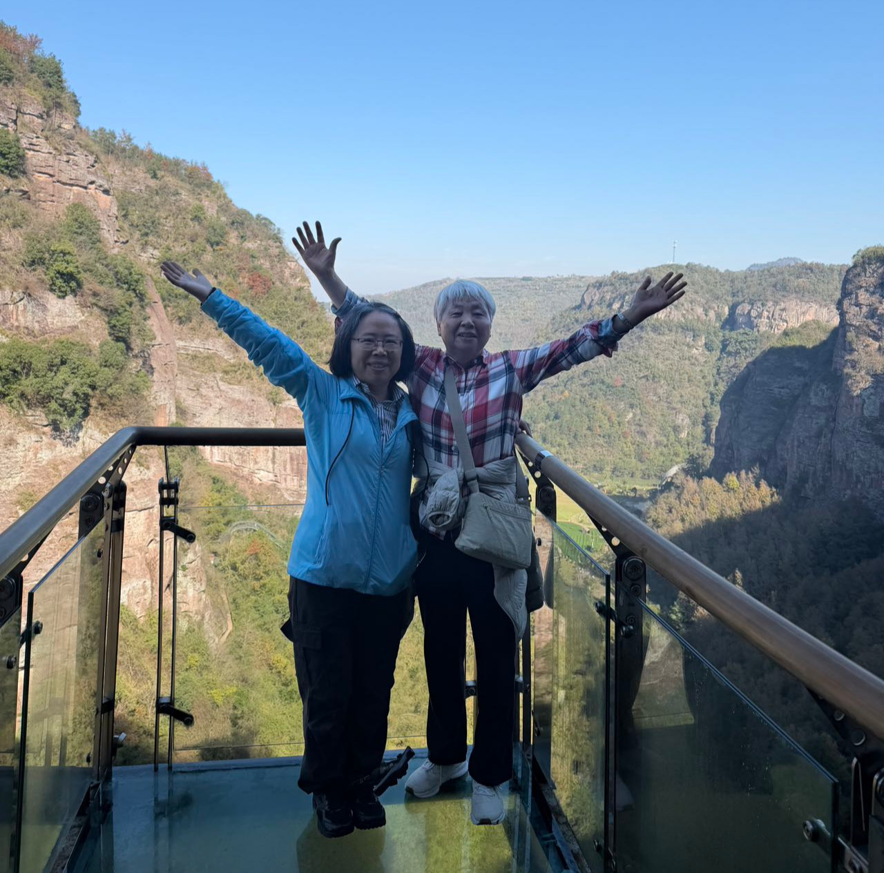拾级而上,脚下是青石板路,身旁是苍翠古木。秋日的调色盘在这里尽情挥洒——枫叶初染微酡,银杏镶缀金边,与常青的松柏交织成斑斓的画卷。溪涧潺潺,鸟鸣清越,空气中弥漫着草木与泥土的芬芳,令人心旷神怡。队伍沿着蜿蜒的栈道徐徐前行,或驻足欣赏奇峰怪石,感叹大自然的鬼斧神工;或于观景平台极目远眺,将连绵峰峦与山下田园风光尽收眼底,顿生“一览众山小”的豪情。