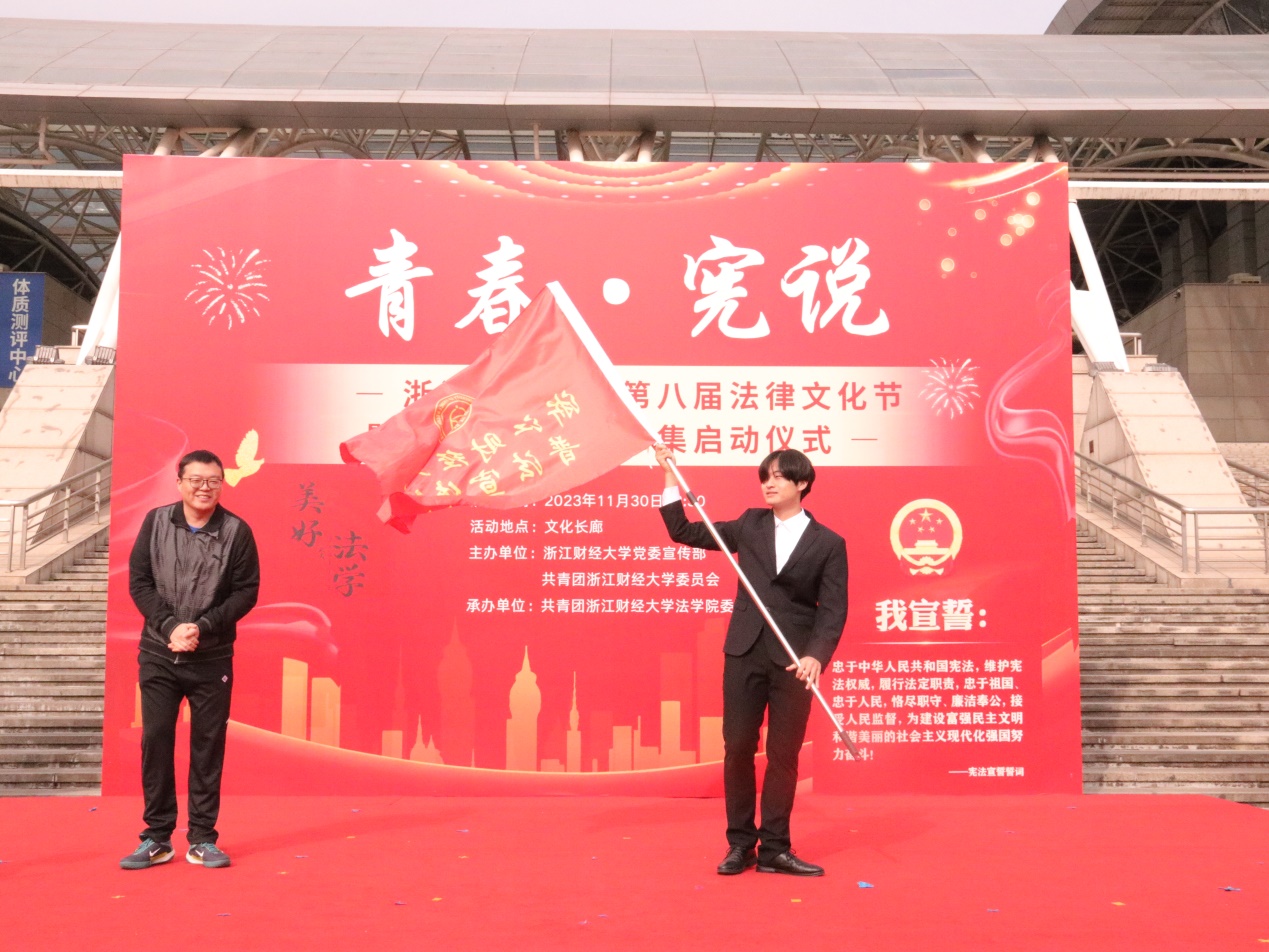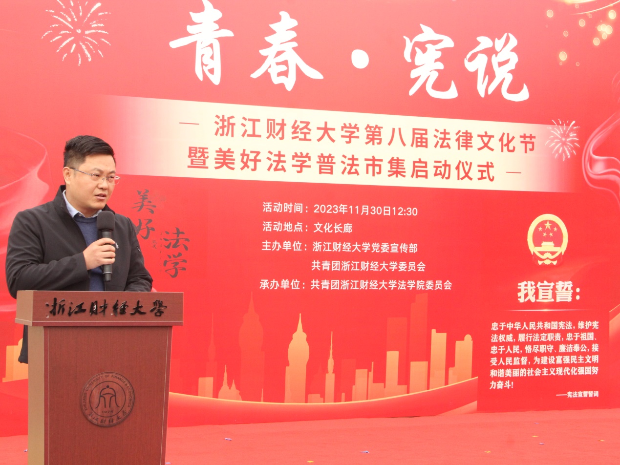 于11月30日举行“青春·宪说”第八届法律文化节暨“美好法学”普法市集启动仪式。校党委宣传部部长王正新、学生处处长曹桢、教务处处长贺武华、校团委书记陆颋浩、色播