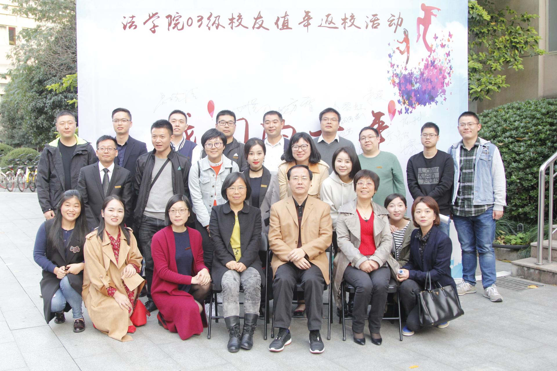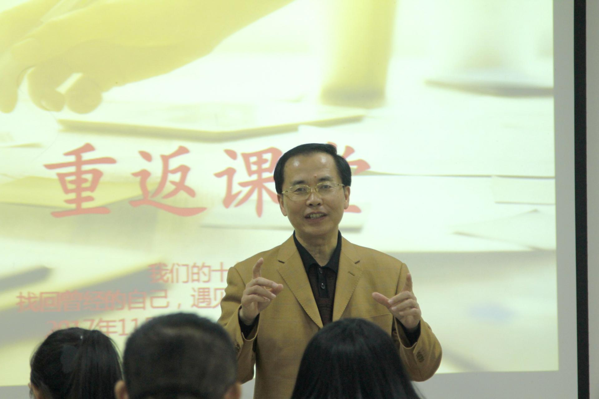 303教室,03级校友们十年后重返课堂,03级曾经的任课老师茅铭晨老师、沈建萍老师、李春燕老师应邀参加活动,带领同学们上了特殊的一课。这节课整整持续了三个多小时,茅铭晨老师回忆了与03级同学在校的点滴,分享了与03级同学的情谊,同时他告诉同学们不断自我提升与从容心态的重要性,也鼓励同学们加强与色播