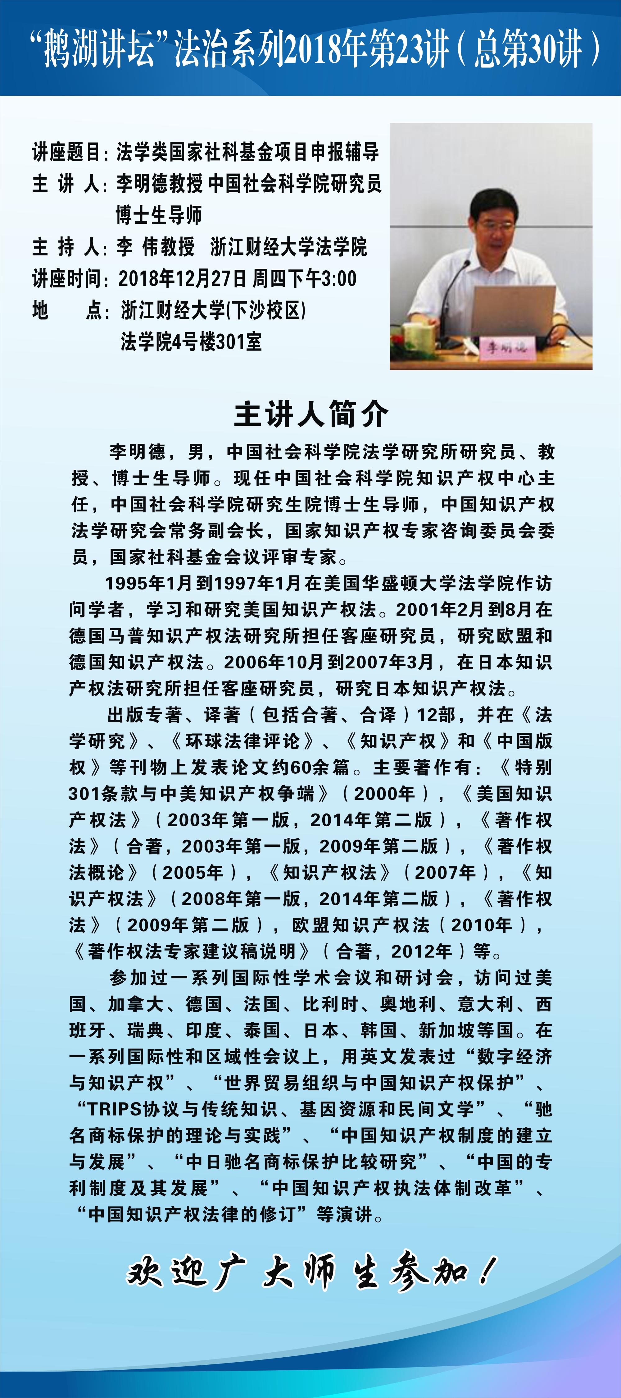 “鹅湖讲坛”法治系列2018年第23讲(总第30讲)中国社会科色播 法学研究所研究员李明德教授